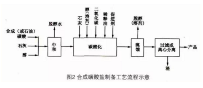 按合成途徑分,以潤(rùn)滑油餾分作為原料生產(chǎn)的磺酸鹽為石油磺酸鹽;而以各種合成烷基苯為原料生產(chǎn)的磺酸鹽為合成磺酸鹽。石油磺酸鹽是以相對(duì)分子質(zhì)量為380的潤(rùn)滑油餾分為原料。合成磺酸鹽的制備(以鈣鹽為例)是以生產(chǎn)12-烷基苯的副產(chǎn)物重烷基苯或烯經(jīng)與苯烷基化制得的合成烷基苯為原料,然后用發(fā)煙硫酸或So3進(jìn)行磺化,得到石油磺酸或合成磺酸;再用石灰與磺酸反應(yīng)(金屬化)生成中性磺酸鈣鹽;最后碳酸化,在醇類促進(jìn)劑存在條件下,加入石灰并通入二氧化碳,得到中堿值或高堿值磺酸鈣鹽。合成磺酸鹽的制備工藝流程見圖2。